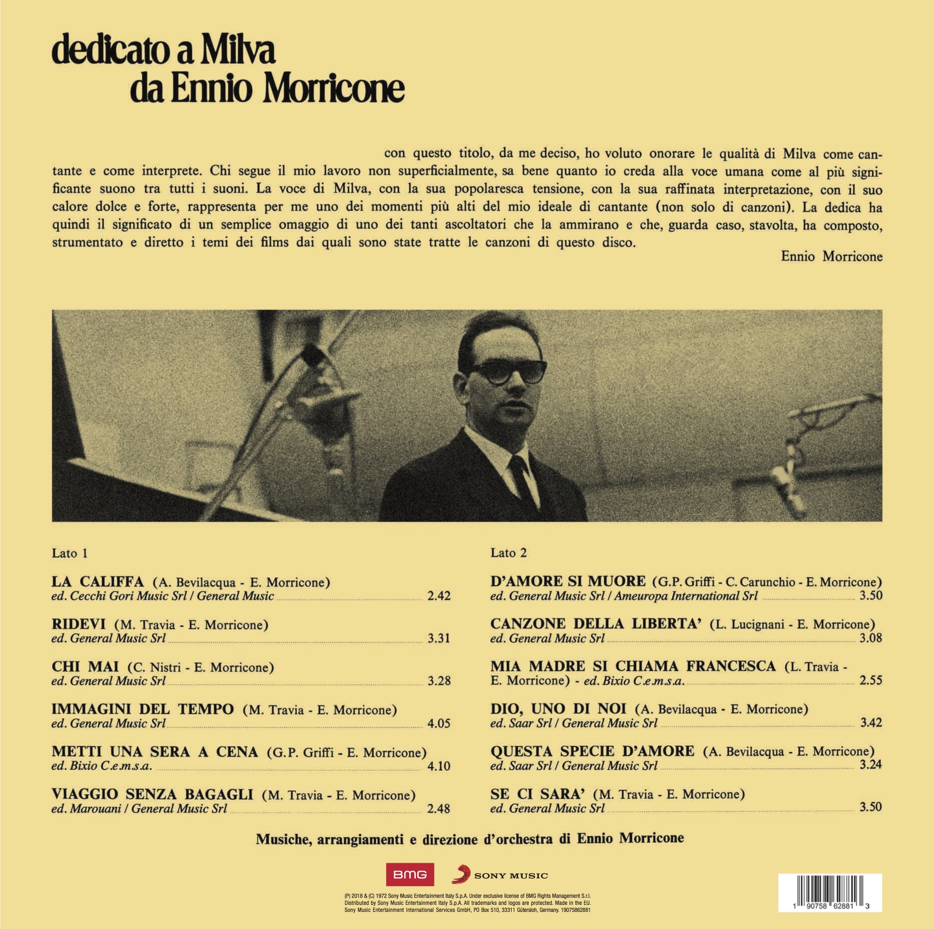 Dedicato a Milva da Ennio Morricone, questo il titolo dell’album, uscì nel 1972 in cassetta e lp. Da allora è stato ristampato solo due volte, ma mai in vinile… nel 1992 in cd con una differente copertina, e nel 1999 inserito in un cofanetto comprendente 13 album della discografia di Milva.