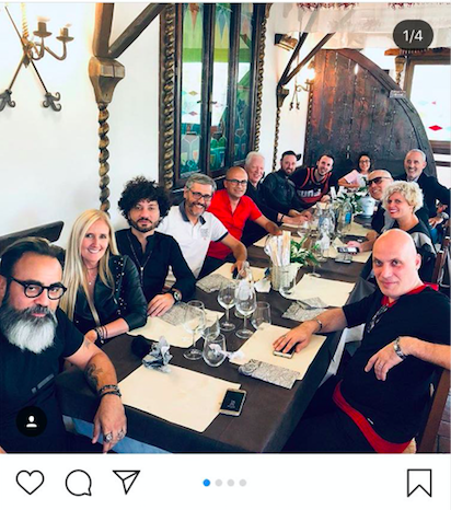 Tra l’altro la foto che segue, e che mi è stata girata, ritrae a cena nel mese di settembre, dopo una masterclass avvenuta nella scuola della discografica di cui sopra il Presidente di Area Sanremo, Maurizio Caridi (da noi video intervistato qui qualche settimana fa) e un altro membro della commissione artistica di Area Sanremo, Gianni Testa, oltre i due vincitori in questione, Anthony & Vittorio Conte.