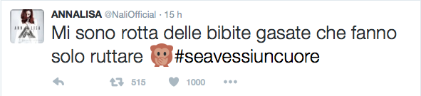 La cantante attraverso il suo profilo Twitter ha lanciato un tweet che in molti hanno interpretato come una chiara polemica inerente questo risultato: “Mi sono rotta delle bibite gasate che fanno solo ruttare #Seavessiuncuore“, il tutto accompagnato come potete vedere nello screenshot qui sotto dalla faccina di una scimmietta che si tappa la bocca.