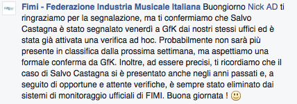 Quindi anche la FIMI con il supporto di GfK ammette che ci sono dei controlli in corso sul “caso Castagna” e che la situazione si è già ripresentata altre volte in passato.