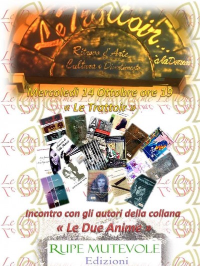 Il 14 ottobre, alle 19, nel locale storico (anche e soprattutto per la musica dal vivo) Le Trottoir di Milano, in Piazza XXIV maggio, ci sarà una una riunione degli autori della collana Le Due Anime che curo per la casa editrice Rupe Mutevole.