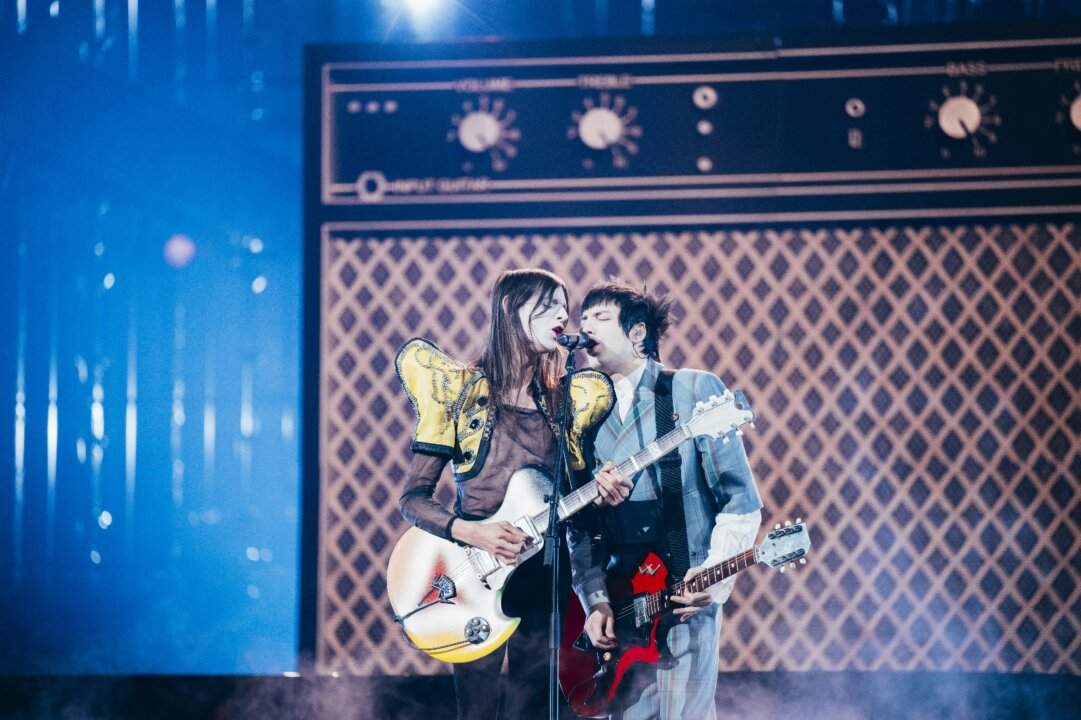 La performance è molto simile a quella di Sanremo, con Lucio che comincia l’esibizione ad un lungo pianoforte nero per poi imbracciare la chitarra e venire raggiunto da Tommaso al centro del palco. Rimangono immutati i costumi di scena (la giacca-bolero con spalline gialle giganti già vista al Festival e il trucco bianco), mentre si aggiunge un oggetto scenico importante che completa l’esibizione: si tratta di due finti altoparlanti giganti, che Lucio ha spesso portato con sé nel suo Club Tour post-Sanremo.