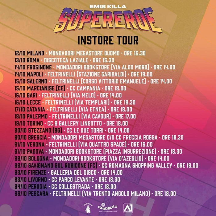 Oggi, 12 ottobre, è il giorno in cui esce Supereroe, il nuovo album di Emis Killa. Un atteso ritorno che abbiamo celebrato proponendo tracklist, racconto di ogni singola traccia del brano, date instore e tour nei club (Qui il nostro articolo).