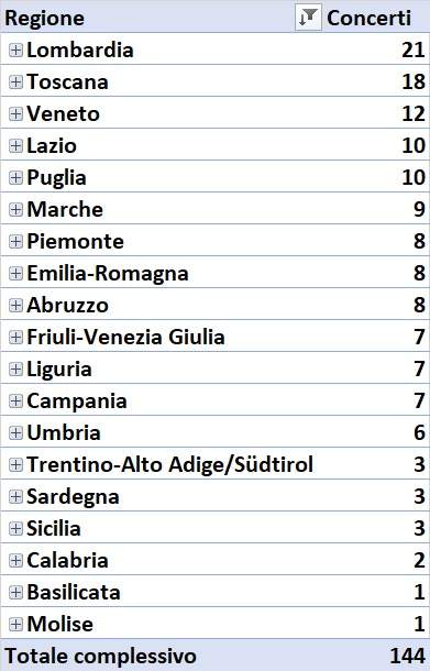 Per evidenti motivi logistici, abbiamo eliminato le tappe che i cantanti nostrani fanno all’estero, così mi rimangono “solo” 139 eventi tra i quali scegliere. Ecco dove sono: