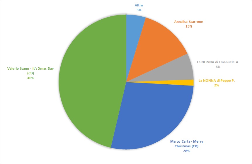 Vince Valerio Scanu con il 46% dei voti validi, seguito da Merry Christmas di Marco Carta (28%) e, al terzo posto Annalisa Scarrone che mi dovete dire quale canzone natalizia ha fatto nel 2014, perché io non l’ho trovata (me l’avete chiesto voi di aggiungerla al sondaggio!!!).