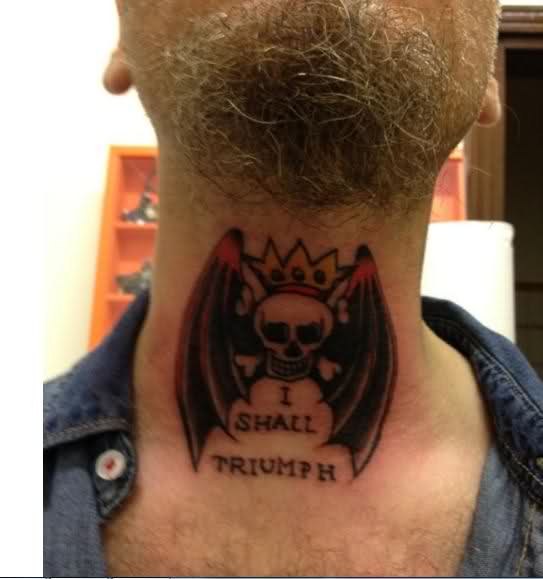 Questo di J-Ax mi fa proprio senso e, per capirlo, sono finita su un sito che si chiama iltatuatore.it: ali di pipistrello, un teschio coronato e la scritta “I shall triumph” che a me sembra un mix tra un benzinaio storpiato e una marca di biancheria intima! Questa cosa si chiama “Sailor Jerry” non chiedetemi perché né cosa sia e/o significhi perché non ne ho idea!