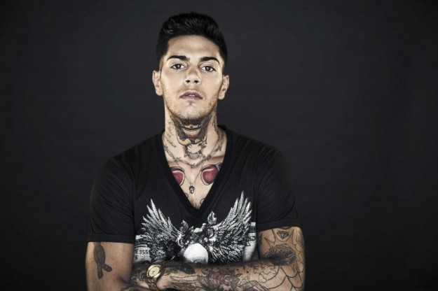 Et voilà il collo di Emis Killa. A me sembra di vedere un’aquila con le ali che vanno verso le tonsille, una “collana” fatta di rovi e, sottostanti, due guantoni da boxer.