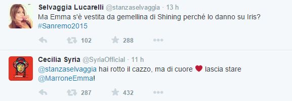 Il mio mito è lei: Selvaggia Lucarelli. Ecco, io le sue cinguettate me le leggo sempre e ieri sera la Selvy (o Gia?) s’è beccata l’attacco di Syria che le ha detto senza mezzi termini di… non rompere il ca**o!