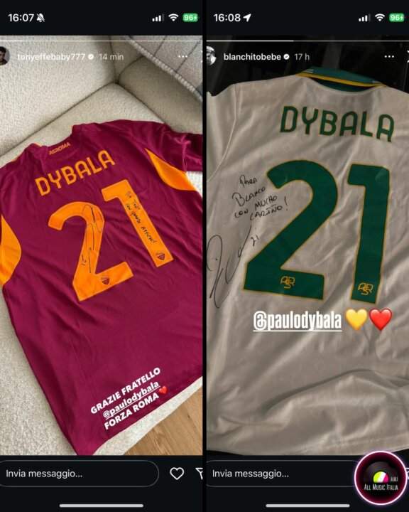 Blanco e Tony Effe hanno pubblicato sui social il regalo ricevuto da Paulo Dybala: la maglia autografata del calciatore della Roma. Un gesto affettuoso? Forse. Ma la Mosca, che non crede mai ai semplici “regalini”, sente subito odore di strategia. La moglie di Dybala è infatti Oriana Sabatini, attrice, modella e cantante argentina che nel 2023 ha già fatto capolino nella scena italiana duettando con Boro Boro nel singolo Coco Chanel. Vuoi vedere che la maglia era solo l’anticipo del prossimo ritornello?