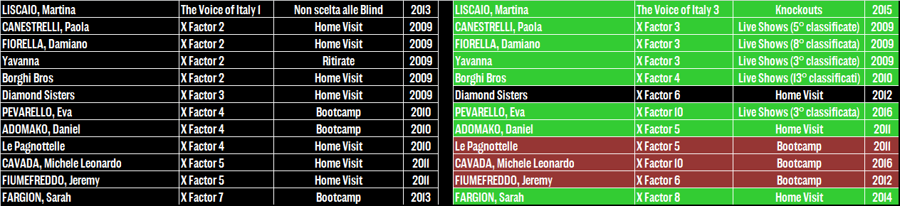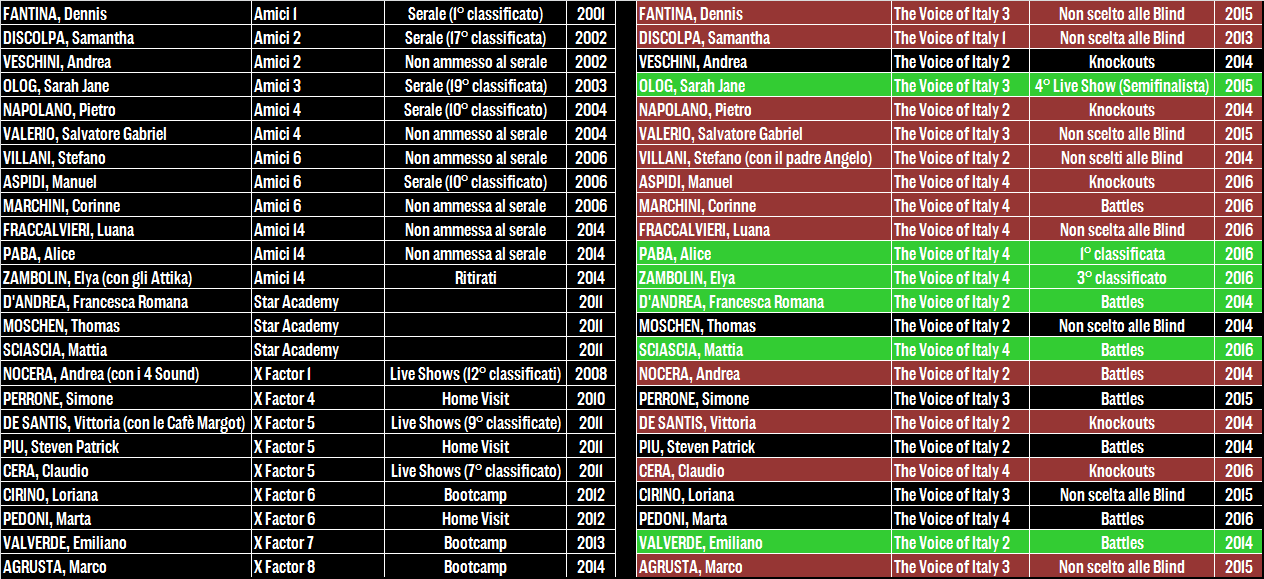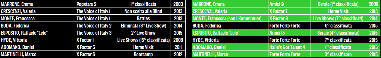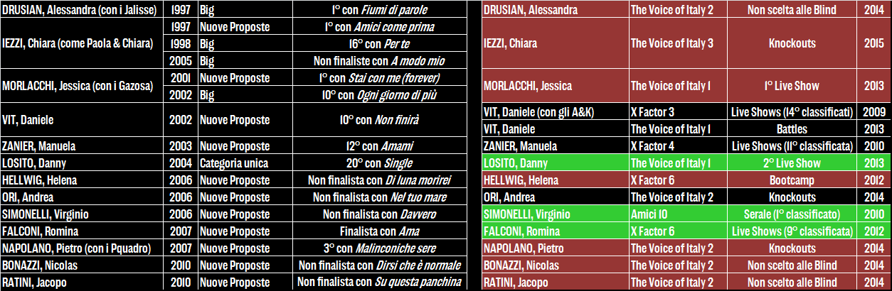 I primi tre nomi sono quelli che destano più scalpore: Alessandra Drusian dei Jalisse vincitori di Sanremo 1997, eliminata alle Blind Auditions di The Voice 2 quando nessun coach si girò per lei; Jessica Morlacchi ex frontwoman dei Gazosa, fatta fuori al primo Live Show (quando ancora ci arrivavano in 32 e non in 20) di The Voice 1 dopo un percorso che per lei era stato fin da subito in salita; ma soprattutto Chiara Iezzi, che se con la sorella Paola aveva vissuto un decennio di successi, Festivalbar, migliaia di dischi venduti e tormentoni entrati ormai nella memoria collettiva – finisce per accontentarsi di una toccata e fuga nella terza edizione del talent di Rai 2. Va meglio a Danny Losito, navigato interprete di Gioia del Colle protagonista (suo malgrado) del Sanremo boicottato dai discografici nel 2004, e soprattutto a Virginio Simonelli che quattro anni dopo la sua rapida eliminazione in Riviera vince Amici 10 davanti ad Annalisa Scarrone, pur non beneficiando dello stesso successo discografico dei suoi predecessori.