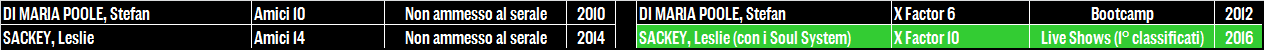 Curiosamente, prima della partecipazione di Enrico Nigiotti, solo due ex Amiciani avevano tentato la strada di X Factor in ben dieci edizioni. Voci di corridoio abbastanza affidabili dicono che ci fosse proprio un veto al riguardo e che nelle edizioni Rai i concorrenti di Amici non fossero ben visti per un ingresso ad X Factor. Tolto Stefan Di Maria Poole, cantautore pop-funky italoamericano che non lasciò grandi tracce in entrambe le sue partecipazioni, il nome “di peso” che fa parte di questa categoria è Leslie Sackey – vocalist dei Soul System, gruppo multietnico veronese trionfatore dell’ultima edizione del talent di Sky. Prima di partecipare a X Factor assieme ai Soul System, Leslie aveva fatto parte della classe di Amici 14 venendo sconfitto (anche lui!) dai The Kolors dopo sole tre puntate e altrettante esibizioni.