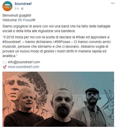 “Il 2018 inizia per noi con la scelta di lasciare la #Siae ed approdare a #Soundreef. – hanno dichiarano i #99Posse – Ci hanno convinto amici musicisti, persone che stimiamo e che ci lavorano. Abbiamo voglia di provare un nuovo modo di gestire i nostri diritti in maniera rapida ed analitica.”
