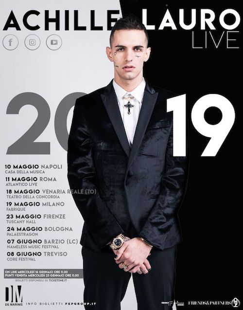 Dal 10 maggio Achille Lauro sarà impegnato nell’ Achille Lauro Live 2019, un tour che lo porterà sui palchi dei più importanti club d’Italia.