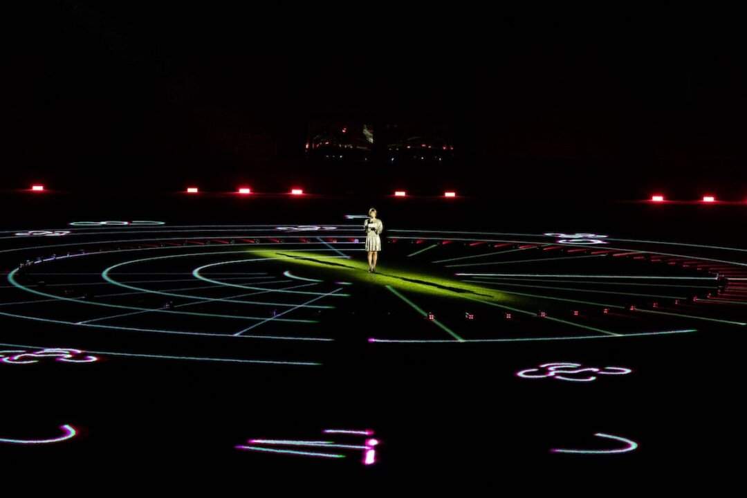 Per l’occasione sul tetto dello stadio sono stati installati 6 proiettori laser da 33W guidati da tre operatori (lo slovacco Martin Gabco, l’olandese Pieterjan Ruysch e l’italiano Marco Malatesta) che, diretti da Luca Toscano, hanno lavorato alla realizzazione di una grafica laser tecnicamente complessa che alterna una parte monocroma che accompagna il racconto intimo della vita di Alessandra a un’esplosione di colore per indicare il suo ingresso nel mondo dello spettacolo, da quando appunto la sua vita si è “riempita di colore”.