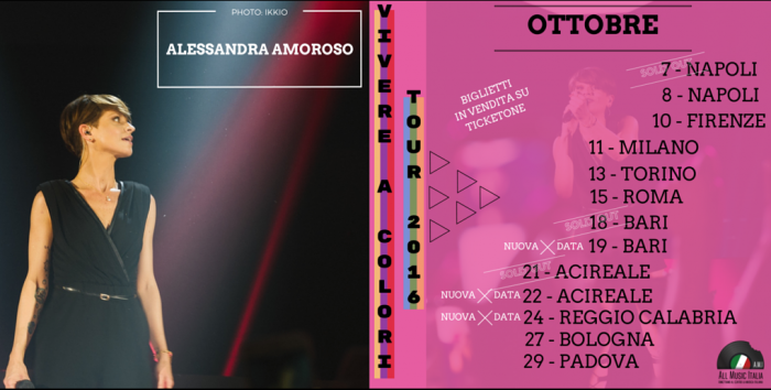 Alessandra nel frattempo dopo le due date di anteprima tour di Milano e Roma si prepara per il tour invernale nel Palasport che partirà il prossimo ottobre, qui di seguito le date e il link per acquistare il vostro biglietto.