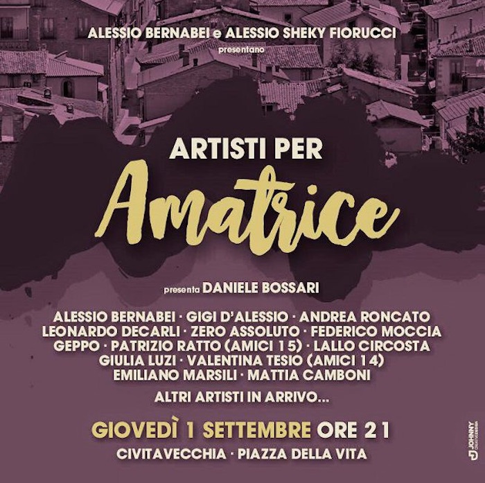 Artisti per Amatrice è il nome del concerto che Alessio Bernabei con la collaborazione dell’autore Alessio Sheky Fiorucci, ha organizzato per il prossimo primo settembre in piazza della Vita a Civitavecchia. Uno speciale live per raccogliere fondi in aiuto della popolazione colpita dal terremoto che coinvolgerà diversi personalità della musica ma anche dello sport.