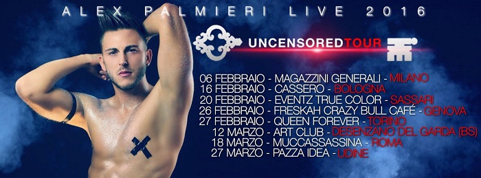È partita sabato scorso da Milano la nuova tournée Uncensored Tour della popstar nata dal web Alex Palmieri. A pochi giorni dal suo venticinquesimo compleanno, Alex ha dato il via a questa nuova tranche di date che per due mesi lo porterà a girare nelle serate gay-friendly più famose d’Italia.