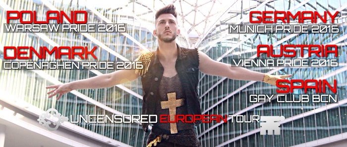 L’Uncensored Tour, partito quest’inverno dai Magazzini Generali di Milano, ha già toccato Bologna, Genova, Sassari, Udine, Torino, Desenzano ed il Muccassassina di Roma ed ora è pronto a conquistare anche l’Europa. Il cantante, infatti, si esibirà per la prima volta a Varsavia (Polonia), al Pride di Vienna (Austria), al Pride di Monaco (Germania), al Gay Club BCN in Spagna fino ad arrivare, ad agosto, al Pride di Copenhagen in Danimarca.