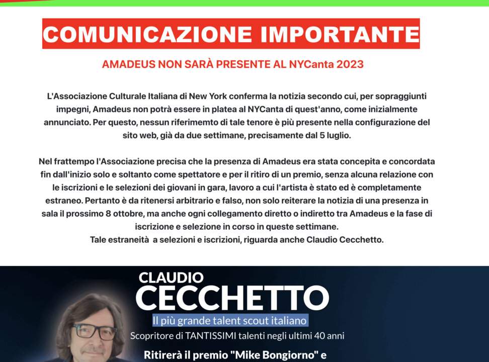 L’Associazione Culturale Italiana di New York conferma la notizia secondo cui, per sopraggiunti impegni, Amadeus non potrà essere in platea al NYCanta di quest’anno, come inizialmente annunciato. Per questo, nessun riferimemto di tale tenore è più presente nella configurazione del sito web, già da due settimane, precisamente dal 5 luglio.