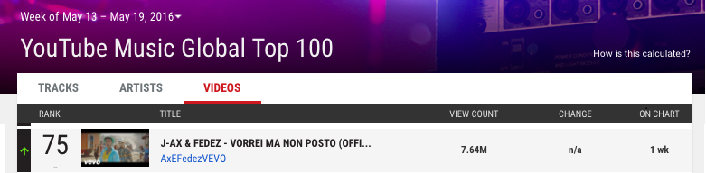 J-Ax batte un nuovo record insieme a Fedez: Vorrei ma non posto è tra i primi 100 video musicali più visti al mondo su YouTube! Si tratta della prima volta che un video italiano entra nella YouTube Music Global Chart Top 100 Videos! La scorsa settimana, infatti, il videoclip è entrato direttamente in posizione 75.