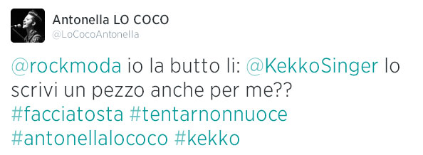 Probabilmente da qui nasce l’idea di Antonella Lo Coco, finalista della quinta edizione di X Factor, di scrivere un tweet per… chiedergli una canzone: