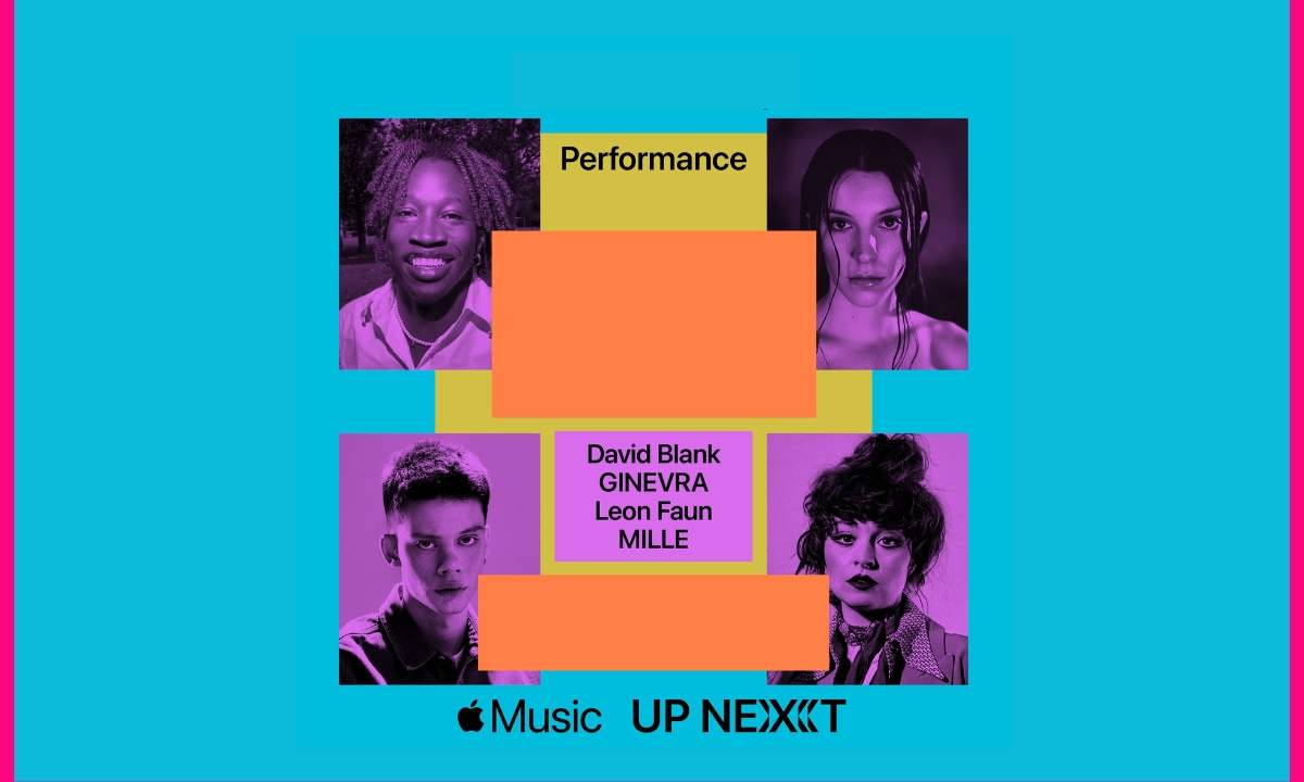 Le quattro voci emergenti selezionate da Apple Music per il programma Up Next Italia, ovvero David Blank, Ginevra, Leon Faun e Mille, si esibiranno live mercoledì 13 settembre alle ore 21 presso il suggestivo anfiteatro di Apple in Piazza Liberty a Milano.