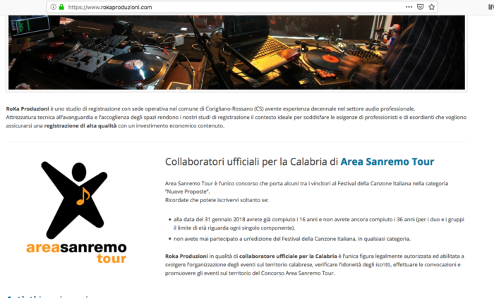 “Roka Produzioni in qualità di collaboratore ufficiale per la Calabria è l’unica figura legalmente autorizzata ed abilitata a svolgere l’organizzazione degli eventi sul territorio calabrese, verificare l’idoneità degli iscritti, effettuare le convocazioni e promuovere gli eventi sul territorio del Concorso Area Sanremo Tour.“