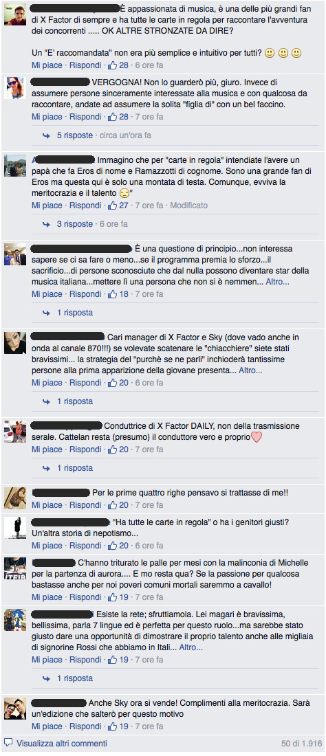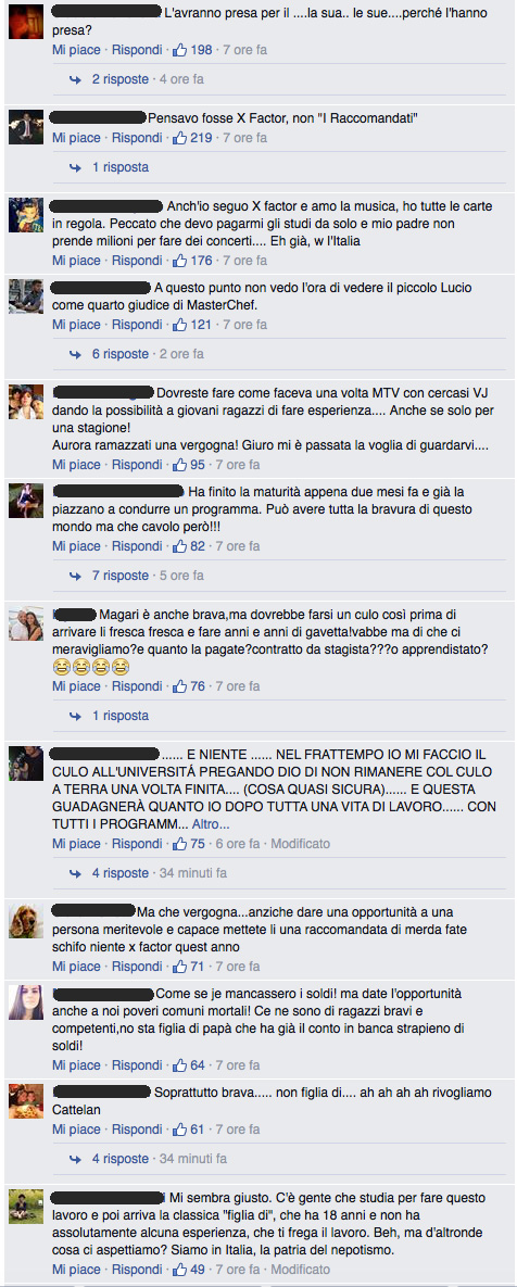 “Che la ragazza volesse andare a parare lì s’era capito abbondantemente vista la richiesta spasmodica di attenzioni, ma si sperava che mamma e papà le dessero il saggio consiglio di fare altro. Siccome però Aurora è maggiorenne e pure se il consiglio c’è stato è comunque libera di fare di testa sua, si confidava nella saggezza di produttori, autori tv e direttori di rete. La saggezza di non farle proposte che non fossero al massimo “la figlia di” a Pechino express o altre piccole opportunità per dire “esisto”, non per dire “faccio la conduttrice”. Mi stupisce perciò la scelta di Sky. Mi stupisce in un programma come X Factor che ha sempre conservato quell’aria un po’ snob della serie “se ti sei sporcato le mani qui non lavori”, mi stupisce perché Aurora Ramazzotti non può entrare, anche se lateralmente, in un programma in cui ci sono Mika e Skin. E rispetto alla massa a me non fa incazzare neppure il fatto che sia figlia di. Mi fa incazzare il fatto che io sia in cerca di una motivazione qualunque oltre alle parentele, anche di quelle vacue che tengono in piedi una scelta seppur discutibile e non trovi neanche quella . Perché guardate che per lavorare in TV a volte basta anche poco, basta l’effimero. Ecco. Io in lei non vedo manco il fascino del nulla”