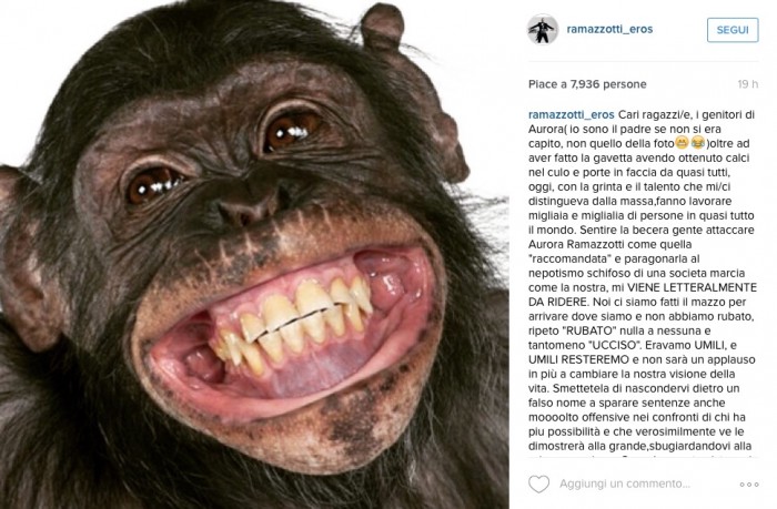 “Cari ragazzi/e, i genitori di Aurora( io sono il padre se non si era capito, non quello della foto) oltre ad aver fatto la gavetta avendo ottenuto calci nel culo e porte in faccia da quasi tutti, oggi, con la grinta e il talento che mi/ci distingueva dalla massa fanno lavorare migliaia e miglialia di persone in quasi tutto il mondo. Sentire la becera gente attaccare Aurora Ramazzotti come quella “raccomandata” e paragonarla al nepotismo schifoso di una societa marcia come la nostra, mi VIENE LETTERALMENTE DA RIDERE. Noi ci siamo fatti il mazzo per arrivare dove siamo e non abbiamo rubato, ripeto “RUBATO” nulla a nessuna e tantomeno “UCCISO”. Eravamo UMILI, e UMILI RESTEREMO e non sarà un applauso in più a cambiare la nostra visione della vita. Smettetela di nascondervi dietro un falso nome a sparare sentenze anche moooolto offensive nei confronti di chi ha più possibilità e che verosimilmente ve le dimostrerà alla grande, sbugiardandovi alla prima occasione. Quando questo sistema in Italia andrà a morire penso si vivrà tutti meglio, chi con più, chi con meno, questa sarà la vita, e questo dovremo accettare, TUTTI,senza INVIDIAps: e fatevela na risata