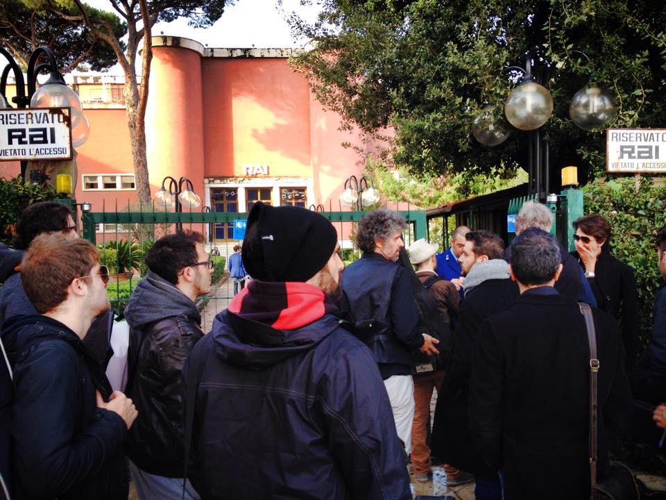 Valutando l’opportunità di tornare a casa, riaddormentarci, risvegliarci e tornare come se nulla fosse stato, magari arrivando per ultimi, ci prendiamo il secondo caffè della giornata, e sono le nove. Torniamo dal caffè e c’è un’altra aria davanti al cancellone verde RAI, tipo primo giorno di scuola, mamme che aggiustano i grembiuli, carezze e strattoni di incoraggiamento e cose tipo in bocca al lupo o simili (e se la balena dicesse lo stesso di tua sorella?). C’è fermento, altroché se c’è. Ci cominciano già a riprendere, dice che è per il backstage, e noi facciamo i disinvolti scambiandoci parole non troppo meditate, speranzosi che nel montaggio opteranno per una veloce carrellata di immagini con Eye of the tiger in sottofondo (considerate le nostre espressioni da duri pronti a tutto e la nostra fisicità mediamente massiccia, Eye of the tiger è veramente molto quotata). Dunque si aprono i cancelli, e sono le dieci meno qualcosa. Ogni tanto arriva un furgoncino, ogni tanto un giurato, diciamo al tipo :”Siamo Freschi Lazzi & Spilli”, lui controlla che siamo in lista e ci lascia passare.