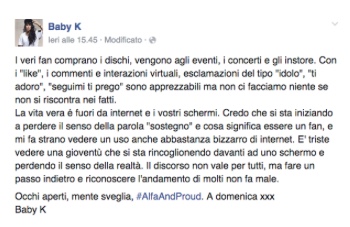 Nel pomeriggio di ieri è apparso sulla pagina Facebook ufficiale della rapper italiana Baby K un post dove la stessa rifletteva sul ruolo attivo che attualmente svolgono i social networks nell’industria musicale.