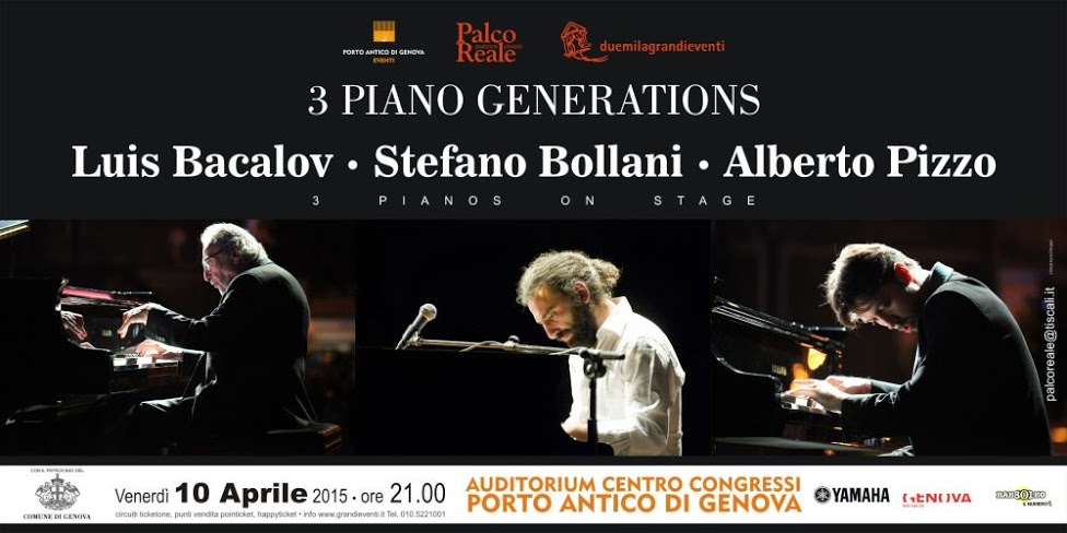 Segnate in agenda questa data: 10 aprile 2015. Sì perché per quel giorno è fissato un concerto evento davvero imperdibile, che andrà di scena a Genova e più precisamente, all’Auditorium Centro Congressi del Porto Antico: un grande live, in cui protagoniste assolute saranno le nostre amate sette note in abito da sera, nel canto dei pianoforti di Luis Bacalov, Stefano Bollani e Alberto Pizzo!