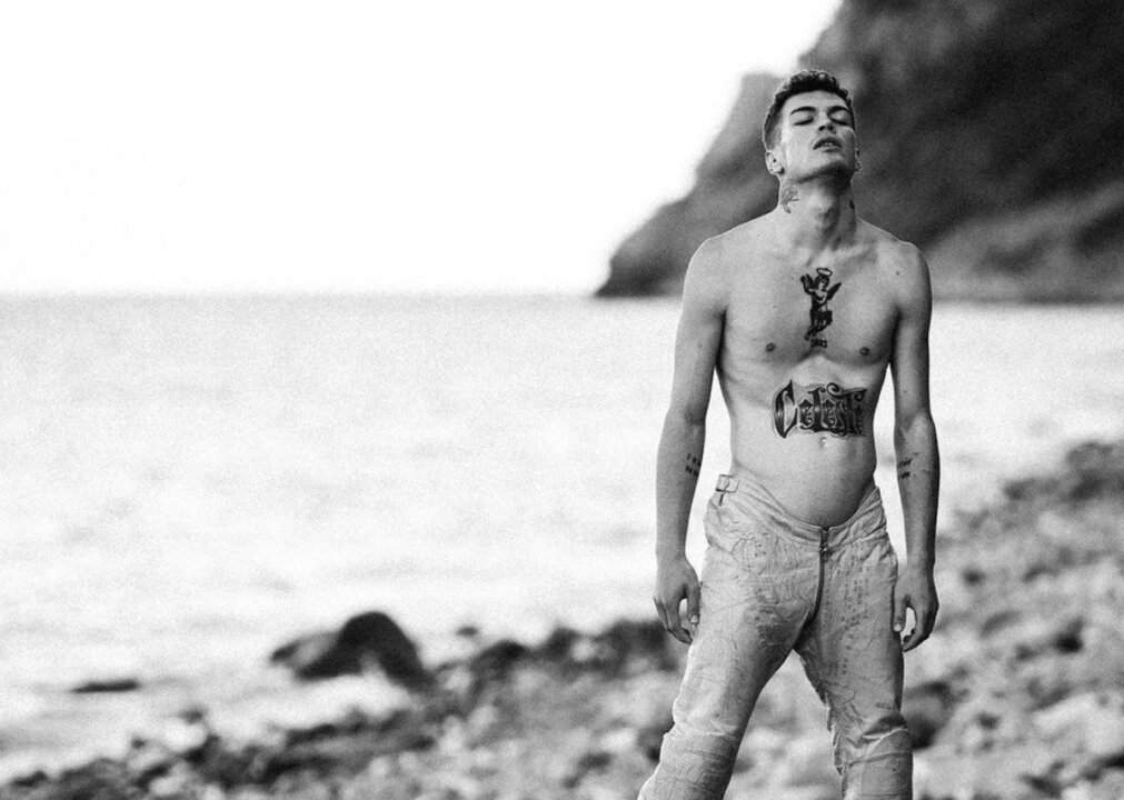 Del resto quella parola, quel colore, celeste, è qualcosa a cui l’artista è molto legato al punto di essersi tatuato sul ventre proprio quella parola: CELESTE.
