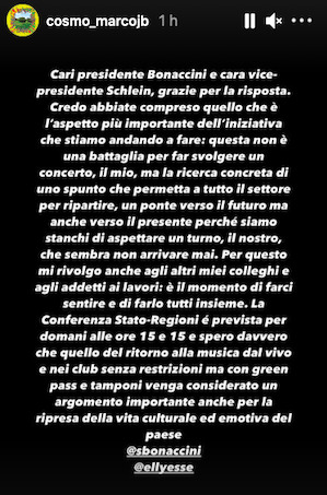 Caro Cosmo, abbiamo letto la lettera che ci hai scritto, nella quale spieghi di volver organizzare un concerto a Bologna a inizio ottobre, in uno spazio sostanzialmente aperto e dove il pubblico, munito di green pass e con tamponi rapidi eseguiti nelle ore precedenti possa assistere in piedi, cantando e ballando, Proponi quindi a queste precise precondizioni di poter derogare delle regole attualmente previste e cioè non costringere il pubblico a rimanere seduto e distanziato. Norme che il Governo invece ha mantenuto ferme, nonostante le richieste arrivate dal mondo della musica. […] Il Governo sta lavorando all’estensione del Green Pass: noi crediamo sia l’occasione giusta e necessaria per fare dei passi avanti. […] E c’è un altro punto sul quale hai perfettamente ragione: si tratterebbe di un ulteriore forte impulso a vaccinarsi.