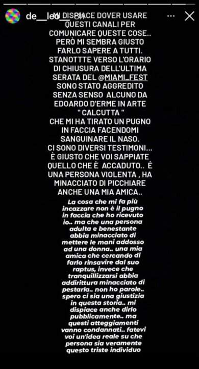 Stanotte verso l’orario di chiusura dell’ultima serata del Miami sono stato aggredito senza senso alcuno da Edoardo d’Erme in arte Calcutta che mi ha tirato un pugno in faccia facendomi sanguinare il naso. È giusto che voi sappiate quello che è accaduto. È una persona violenta, ha minacciato di picchiare anche una mia amica.