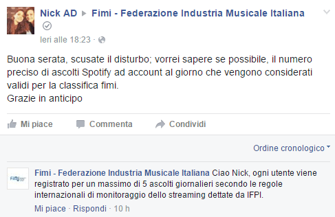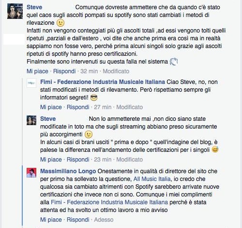 Lanciammo anche delle domande chiare a FIMI e Spotify, che risposero con due comunicati ufficiali, non fugando tuttavia i dubbi nostri e di molti lettori. Da allora, non siamo più tornati sulla questione sul nostro sito, tuttavia ogni settimana, puntualmente, la pagina Facebook di FIMI si arricchisce di molte domande degli utenti sul caso streaming e certificazioni.