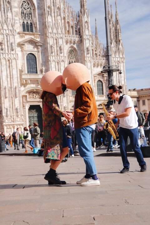 Al parco, sul tram, tra le vie del centro due persone con in testa un grosso occhio azzurro hanno attirato l’attenzione dei milanesi che si sono ritrovati davanti a queste singolari figure che, tra una camminata e l’altra, hanno anche danzato in un romantico passo a due.
