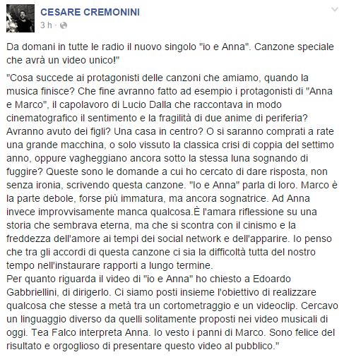 È con un lungo post su Facebook che Cesare Cremonini annuncia l’uscita, domani 9 gennaio, del nuovo singolo intitolato Io ed Anna, una sorta di omaggio a Lucio Dalla e alla sua Anna e Marco.