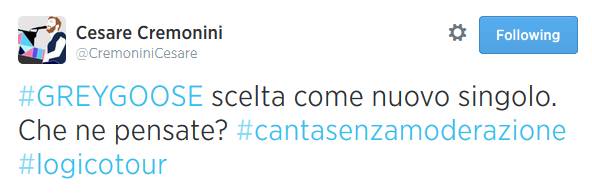 E mentre i fan attendono l’arrivo dei concerti, nell’airplay radiofonico spunta un altro brano di Cesare: GreyGoose, terza traccia di Logico, una delle preferite dal cantautore come rivelava durante la conferenza stampa di presentazione del disco: “Sono innamorato di questa canzone perché ha un sound nuovo per me, ed è il frutto di una ricerca ossessiva sia sul testo che sulla musica con l’intento di farmi burla del concetto di “canzone d’amore”. E’ la mia “50 Special” dell’età adulta“.