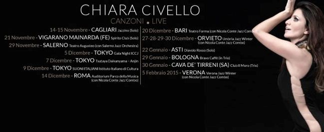 Intanto la Civello è anche pronta per tornare in Tournée in Italia con la versione invernale di Canzoni Live, ma non solo. Partirà il 14 novembre, infatti, il nuovo tour in cui la cantautrice cambierà volto, mostrando diverse sfaccettature della propria personalità artistica: a volte accompagnata dalla Salerno Jazz Orchestra, a volte dal Nicola Conte Jazz Combo e a volte in versione solista, sul palco soltanto con la sua chitarra, dando spazio al lato più intimista dei brani. Di seguito le prime date confermate: