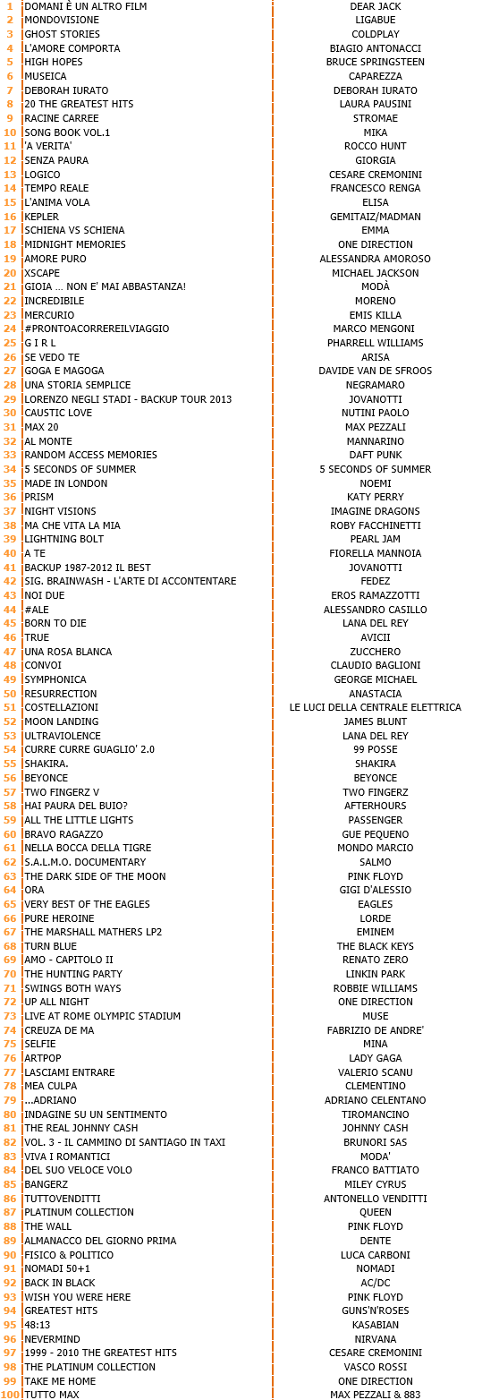 Al secondo posto c’è invece Mondovisione di Ligabue, che aveva già conquistato il titolo di album più venduto del 2013, mentre sul gradino più basso del podio, al terzo posto, i Coldplay con Ghost stories.