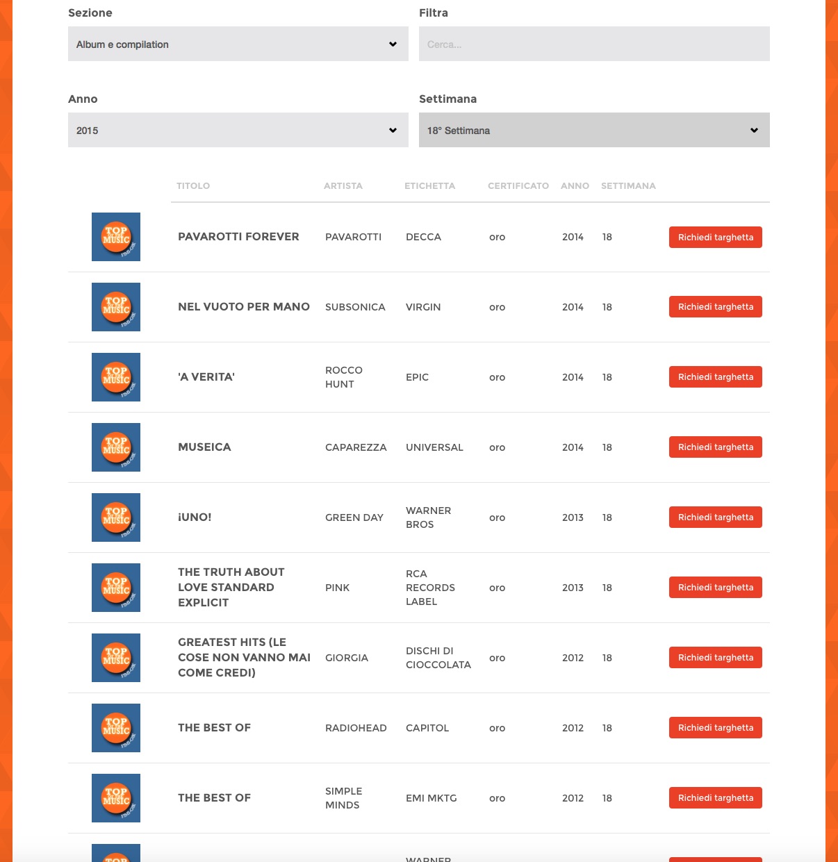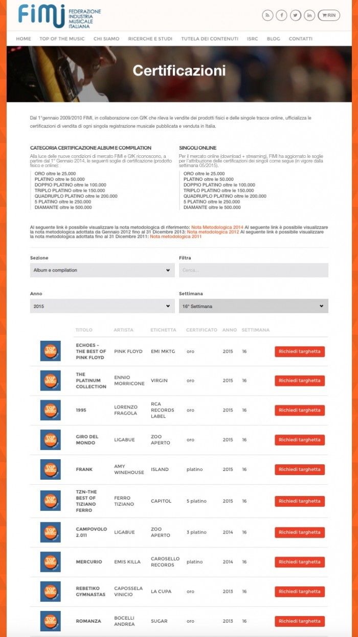Questa settimana andando a guardare le settimane 16/17 e 18 del 2015 risulta che molti dischi, anche del passato, si sono aggiudicati nuove certificazioni. Se inseriamo per esempio settimana 16 del 2015 risulterebbero tra gli altri Emis Killa, Virginio ed Emma certificati con dischi d’oro o di platino (come da immagine sottostante).