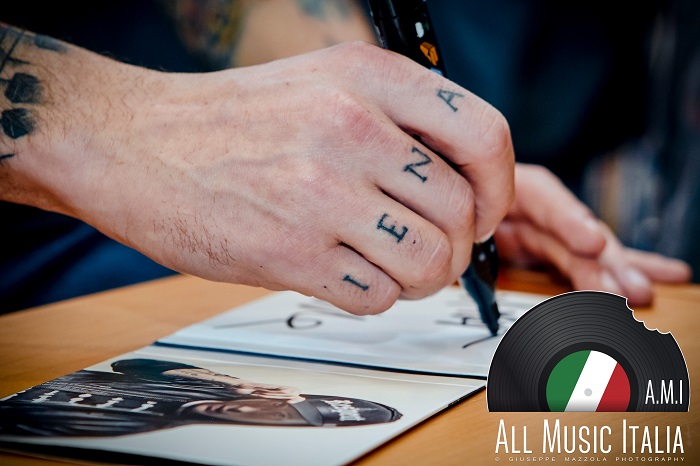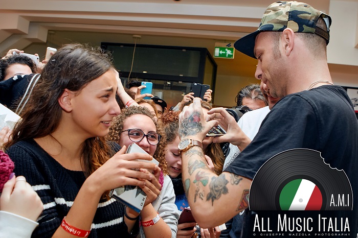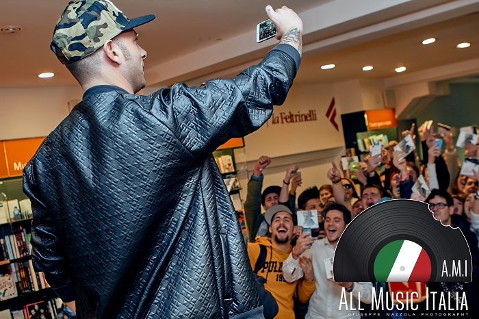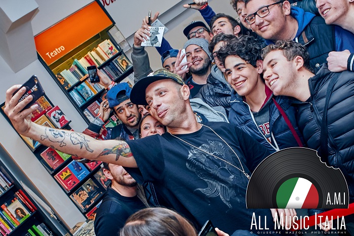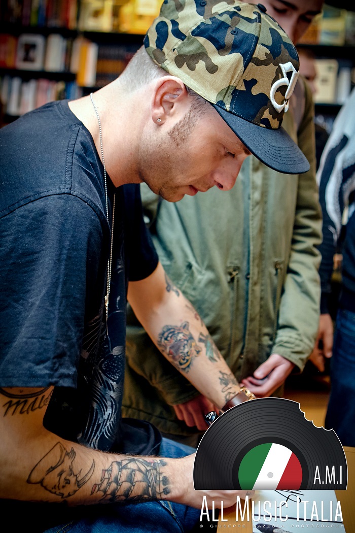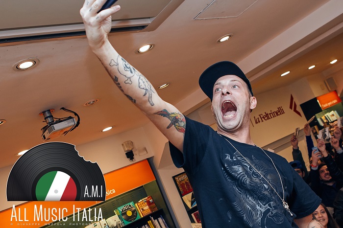 L’Instore è cominciato intorno alle 17:00, almeno duecento fedelissimi accalcati a un palmo di naso dal rapper hanno reso la situazione più un preambolo al concerto rock dell’anno che allo stereotipato e meccanico firmacopie al quale, ormai, moltissimi artisti nostrani, ci hanno abituati.