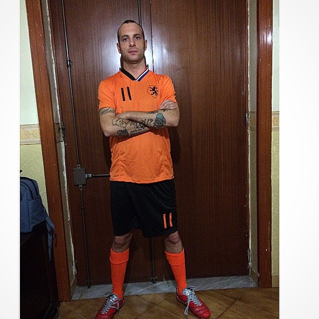 “BUONGIORNO !! Finalmente si lavora “nostop” al disco nuovo!!! Mi sono vestito da Capocannoniere Olandese !! Sembro Robben !! @djshablo Arrivo!!!! #napoli #perugia #argentina #italia #olanda #clementinonewalbum2015”
