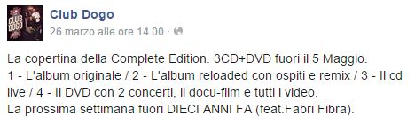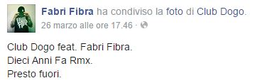 Nella riedizione del loro ultimo album Non siamo più quelli del Mi Fist – The Complete Edition, i Club Dogo regalano ai loro fans il brano Dieci anni fa con la partecipazione di Fabri Fibra. Il brano sarà in rotazione radiofonica a partire dal 31 marzo e sarà, quindi, curioso vedere la collaborazione di queste due punte del settore affiancarsi e scambiarsi i versi durante l’esecuzione del brano.