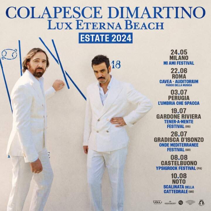 Dopo l’uscita del loro nuovo e attesissimo album, “Lux Eterna Beach” (Numero Uno / Sony Music), e un tour invernale che ha fatto registrare numerosi sold-out, Colapesce Dimartino annunciano le prime date – prodotte e organizzate da Vivo Concerti – del “Lux Eterna Beach Estate 2024“.