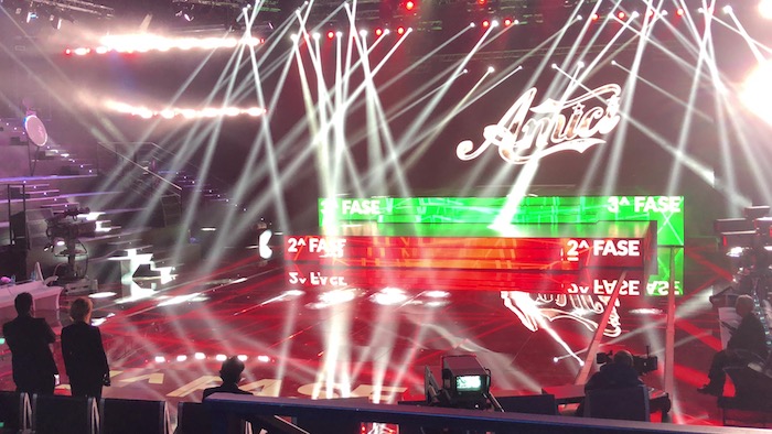 “Il palco ha l’impianto di Led più grande mai costruito al mondo. La sfida di quest’anno sarà di far volare le scenografiche in caso dovessimo decidere di usarle, su un binario, quindi tutto ciò che entrerà in studio sarà volante ma soprattutto ci sarà la coreografia più immersiva mai sviluppata in uno studio televisivo perché le grafiche ci porteranno direttamente immediatamente dentro a dei mondi, quindi i nostri protagonisti, i ragazzi, voleranno dentro queste grafiche sviluppate dai nostri grafici.”
