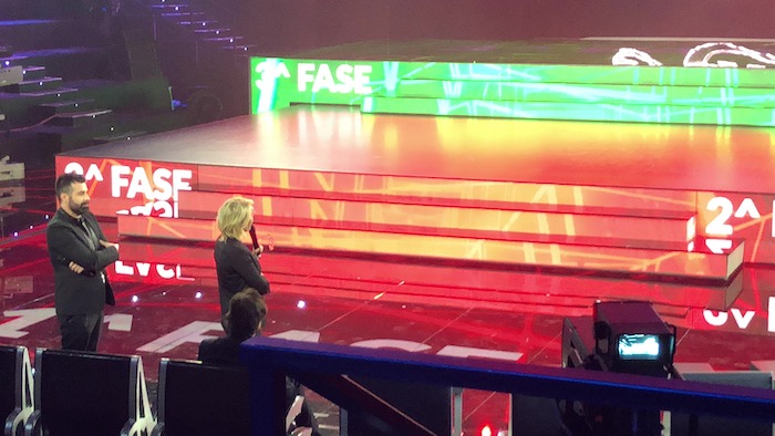 “Quando ho iniziato a pensare al contenuto del programma ho chiesto a Luca e al coreografo, Matteo Oioli, di cercare e pensare ad una scenografia che aiutasse nella comprensione del programma. Voi ora potete vedere i tre palchi in anteprima, il pubblico a casa capirà sabato quel che abbiamo realizzato.”