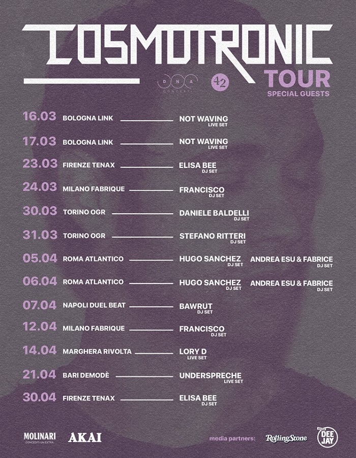 “Cosmotronic non è solo un concerto, è una super serata, una festa, un festival itinerante. Come promesso ci saranno altri ospiti oltre a IVREATRONIC, e sono veramente orgoglioso di annunciarli: NOT WAVING, Elisa Bee, Francesco De Bellis aka Francisco, Daniele Baldelli, Stefano Ritteri, Hugo Sanchez, Bawrut, Lory D, e Underspreche. Ci divertiremo.” queste le parole affidate ai Social che svelano una line up di tutto rispetto.