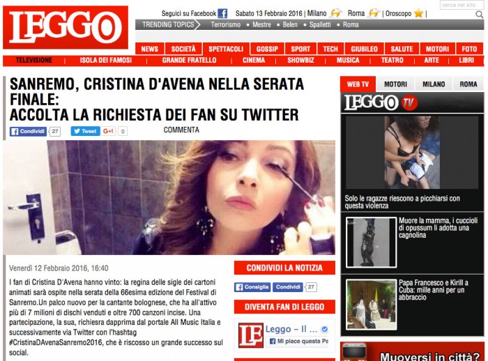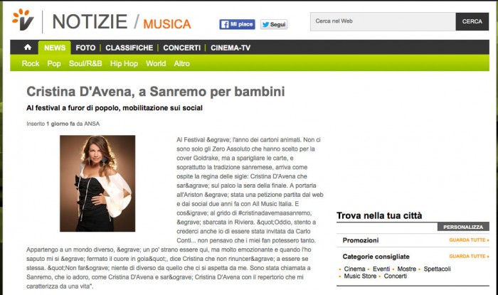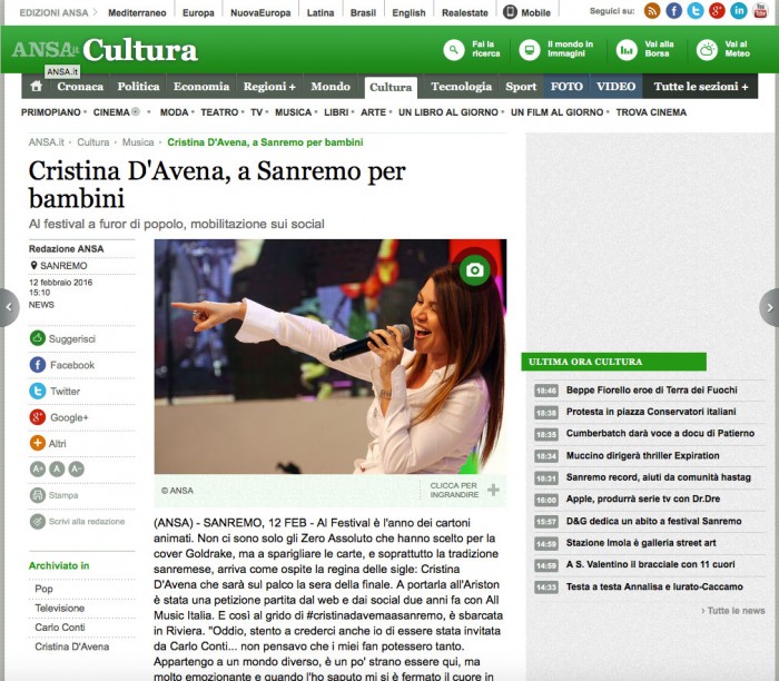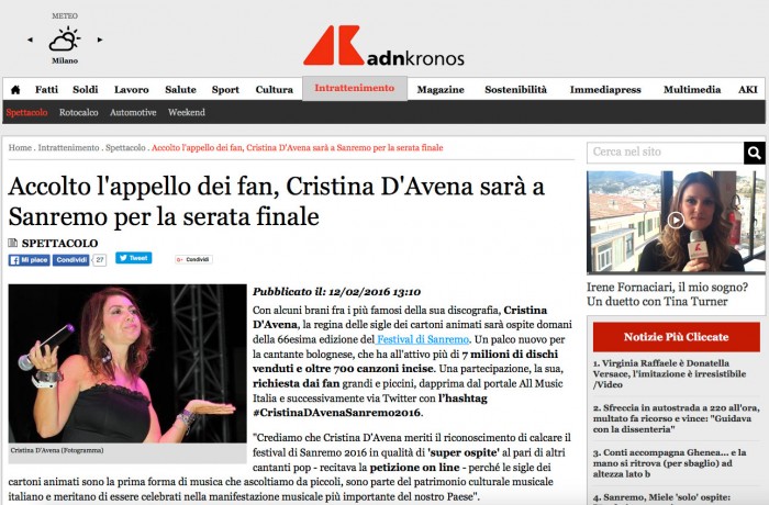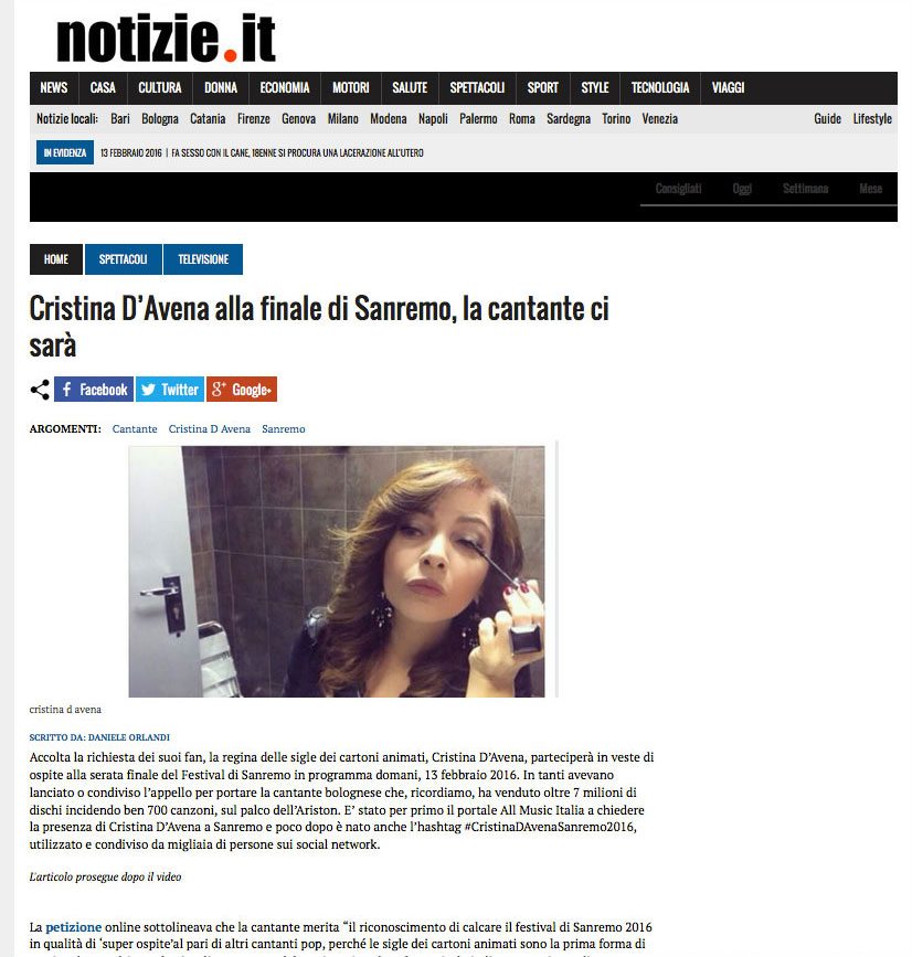 “Crediamo che Cristina D’Avena meriti il riconoscimento di calcare il festival di Sanremo 2016 in qualità di ‘super ospite’al pari di altri cantanti pop perché le sigle dei cartoni animati sono la prima forma di musica che ascoltiamo da piccoli, sono parte del patrimonio culturale musicale italiano e meritano di essere celebrati nella manifestazione musicale più importante del nostro Paese“.
